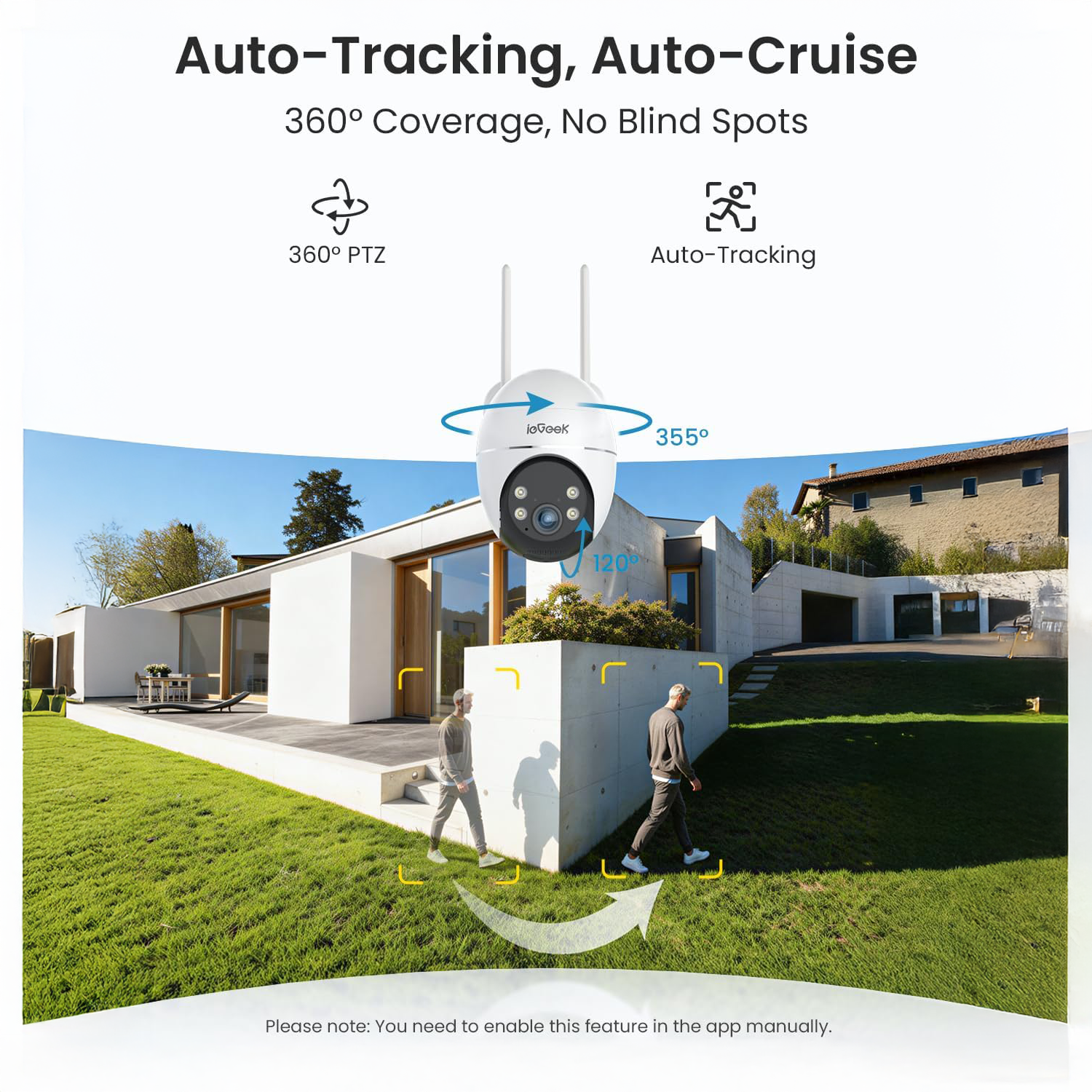 The 360° PTZ with auto-tracking follows moving objects (up to 100 feet detection) for complete coverage without blind spots.