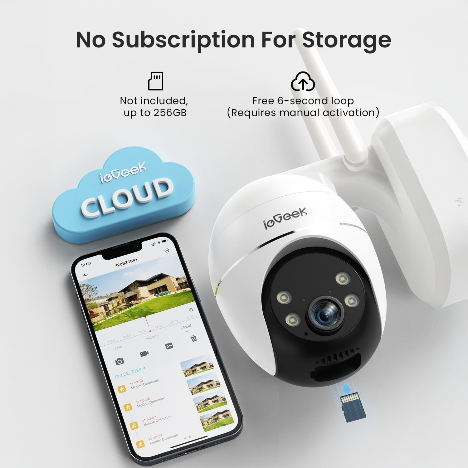 Supports micro SD card up to 256GB for local storage and free lifetime basic cloud storage (6-second clips with 7-day loop).